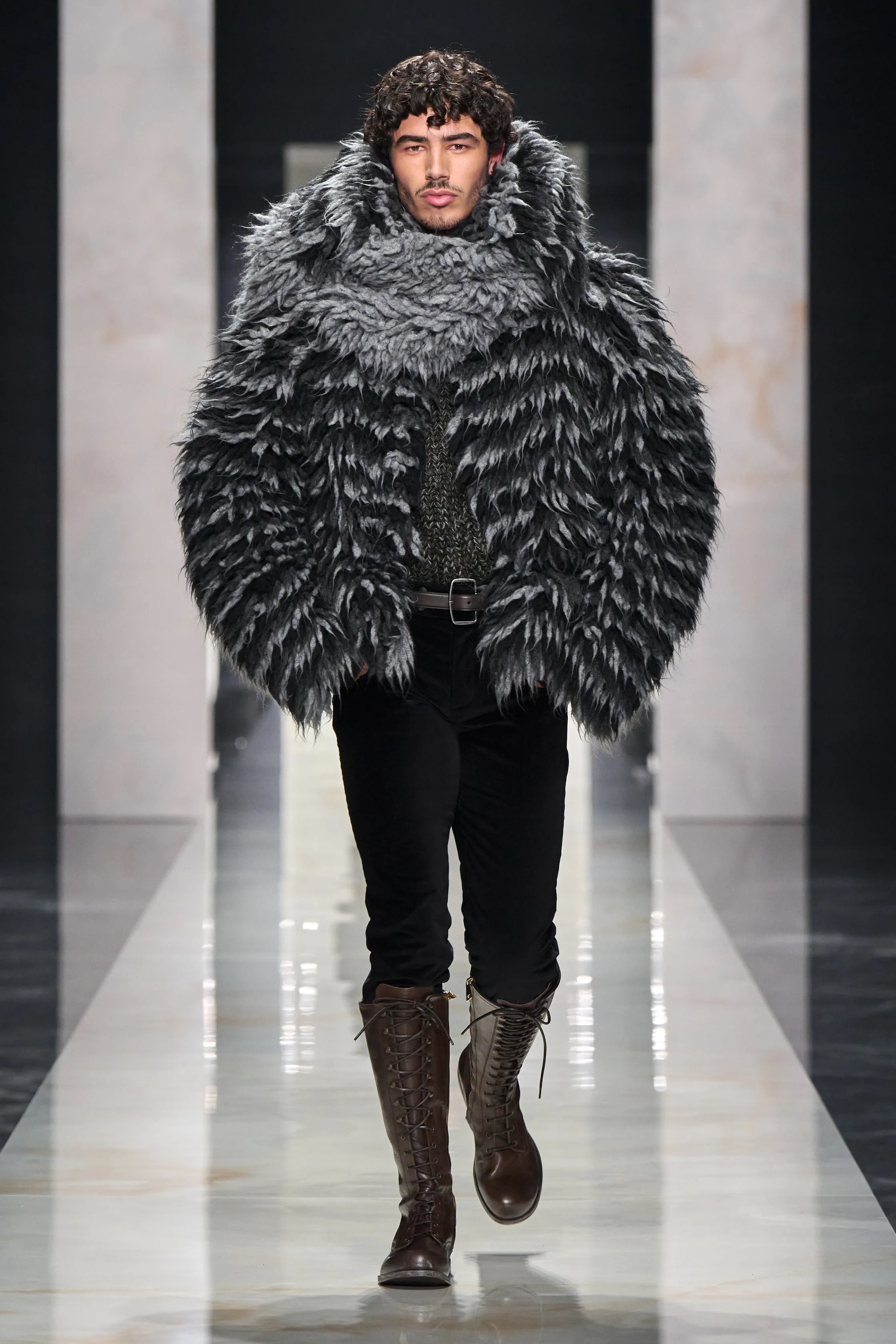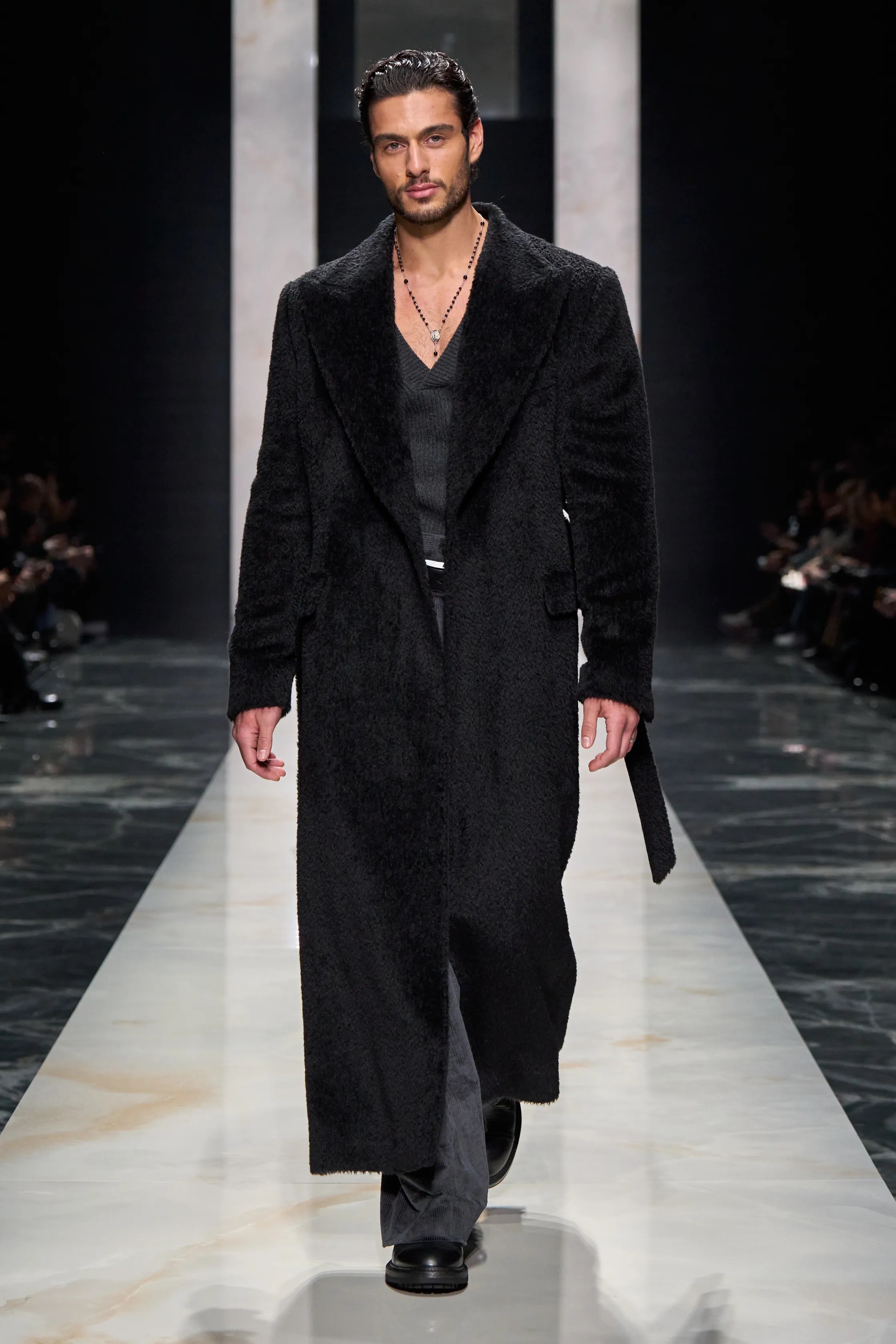 Outerwear leaned into impact. Faux-fur trench coats felt less about function and more about making an entrance. Leather bikers and bombers were layered over distressed denim with a deliberate ease, while velvet appeared in unexpected forms, including robe-like evening pieces that blurred the line between intimacy and occasion.