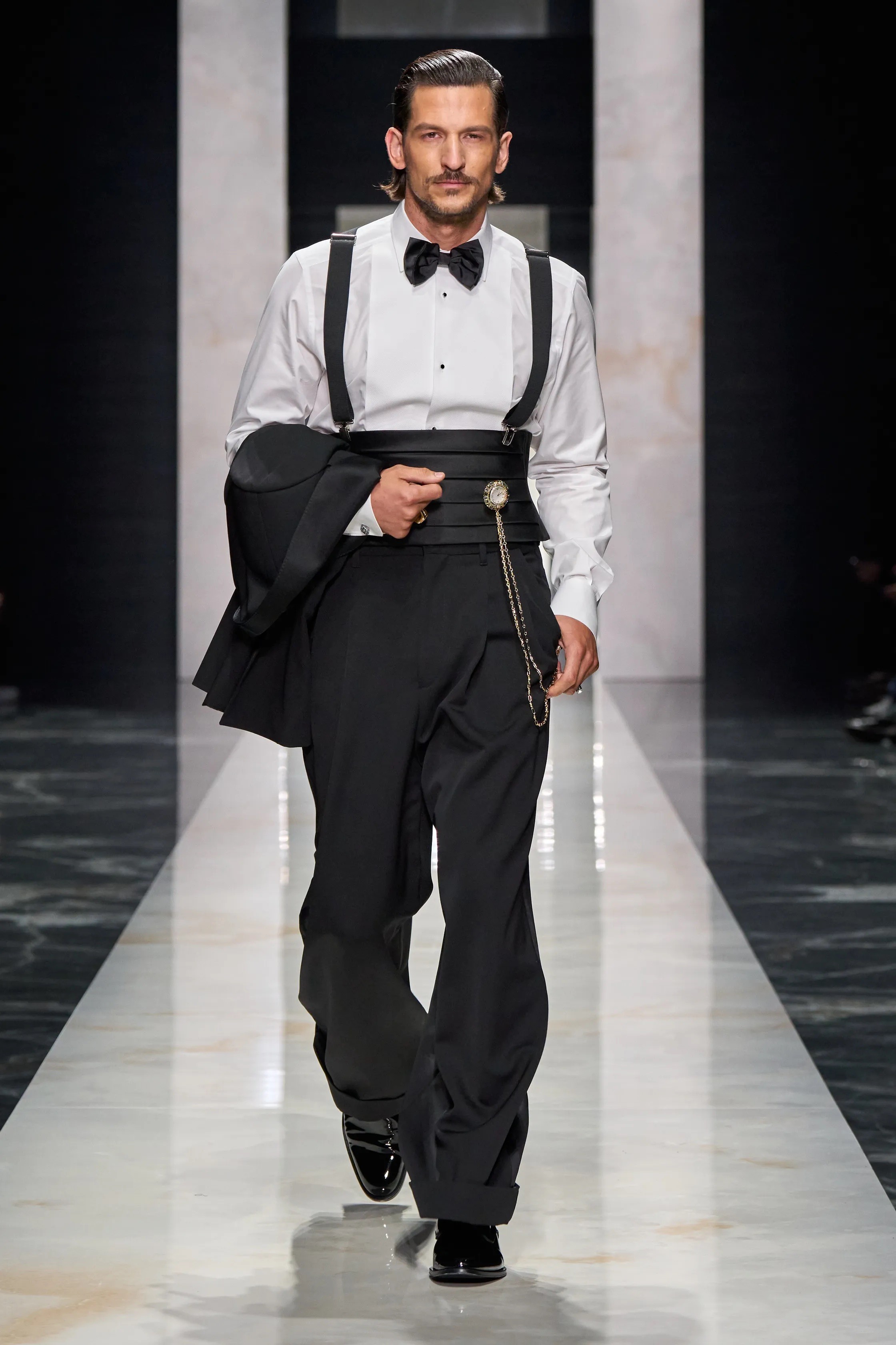 Eveningwear brought a subtle sense of provocation. Dark tuxedos were cinched at the waist, reshaping classic proportions and quietly challenging traditional ideas of male elegance. Throughout, the styling reinforced a sense of confidence that felt deeply ingrained as opposed to being loud.
