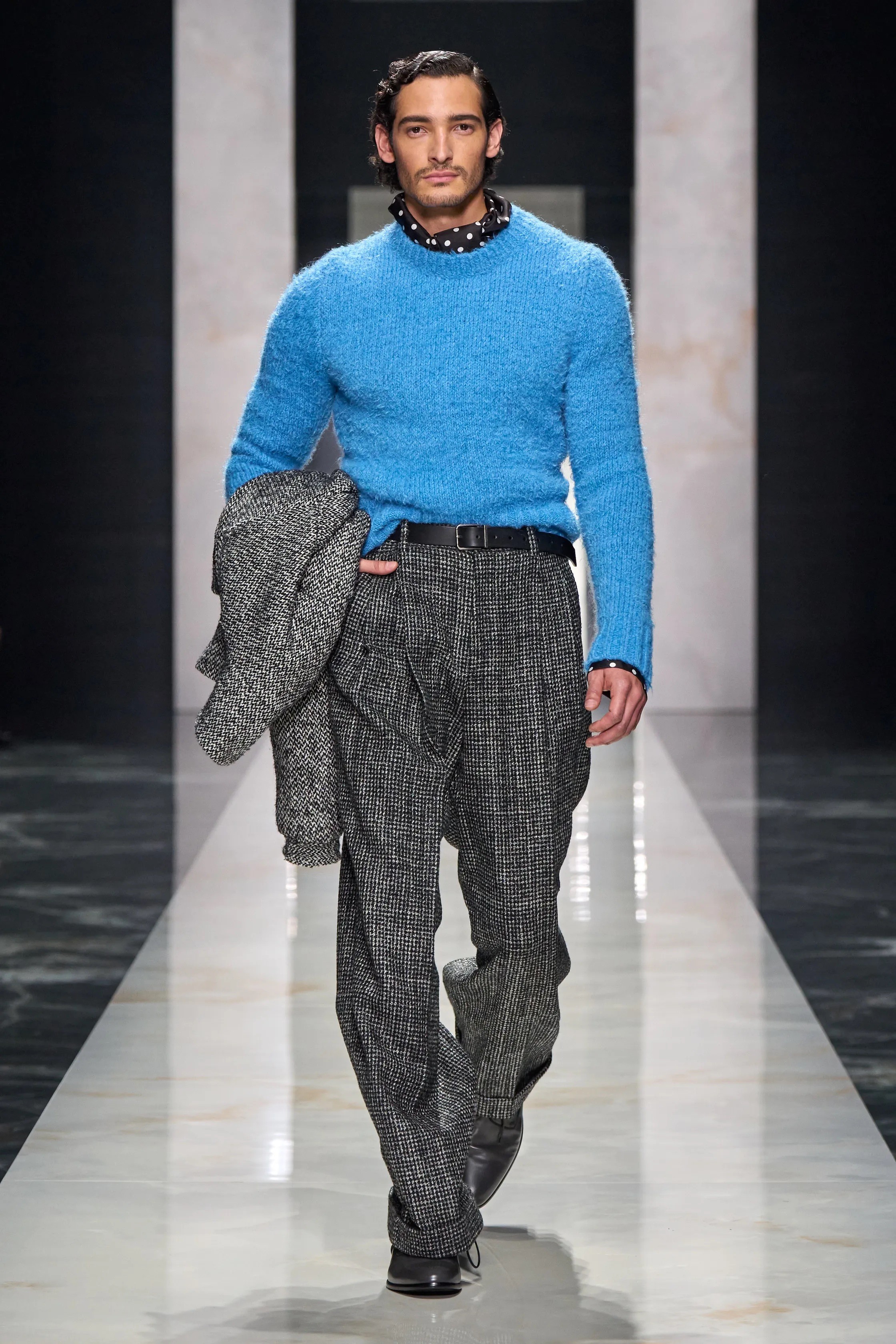 Tailoring anchored the collection, but it was never rigid. Softly structured suits in salt-and-pepper wools moved easily on the body, often paired with high-waisted trousers that referenced the past. Sharp double-breasted coats were thrown over relaxed silhouettes, while knitwear softened formality, suggesting clothes designed to be worn, reworked, and lived in.
