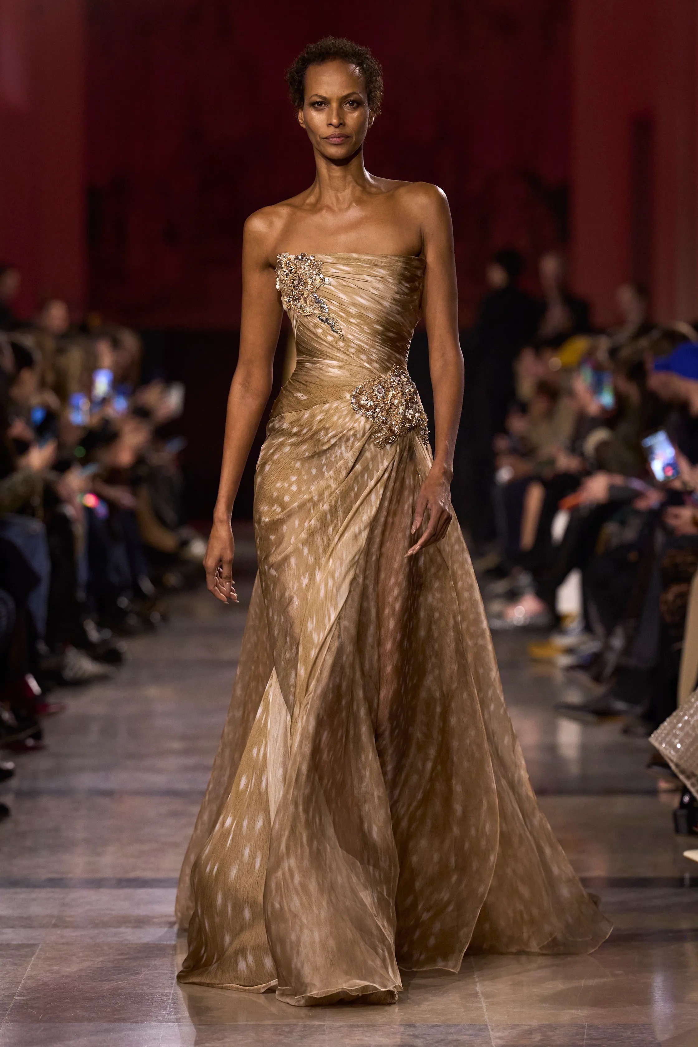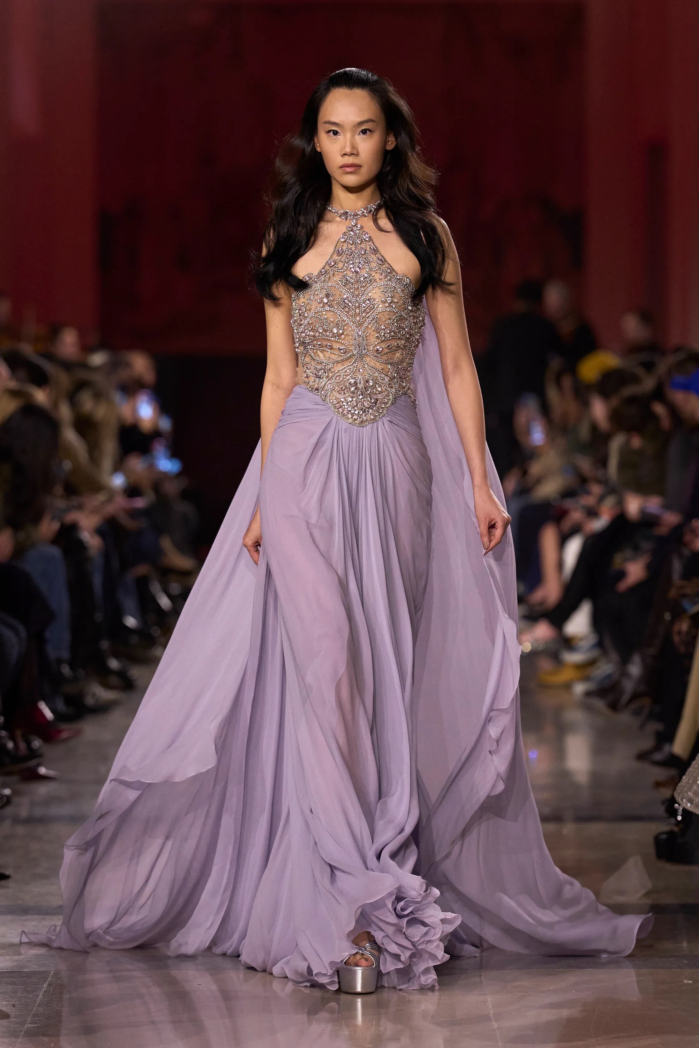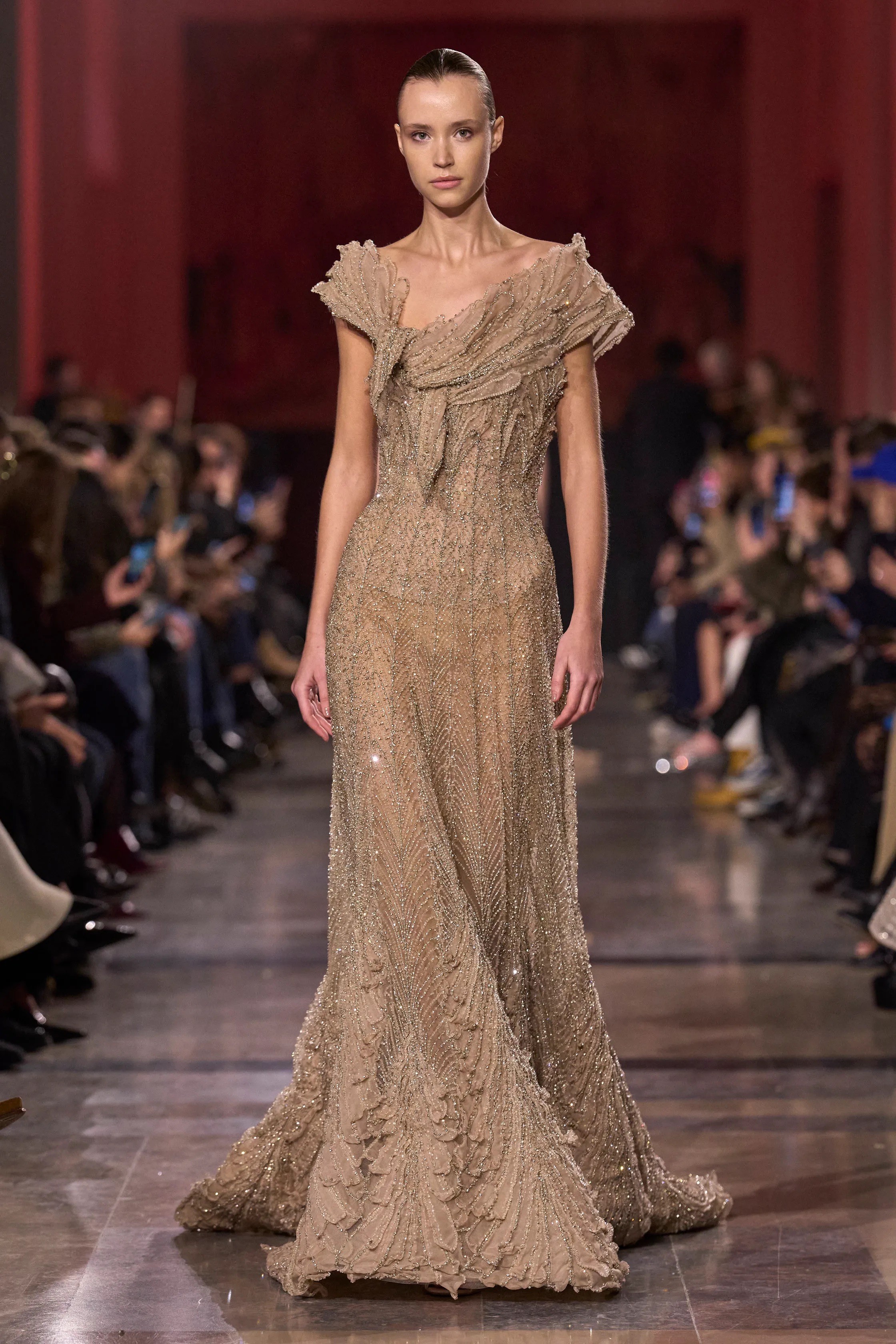 For evening and awards season, Saab leaned into new techniques without losing his red-carpet instincts. Gradient metallics in gold and silver carried subtle Art Deco references, nodding both to the venue and to the designer’s enduring fascination with past eras of glamour.