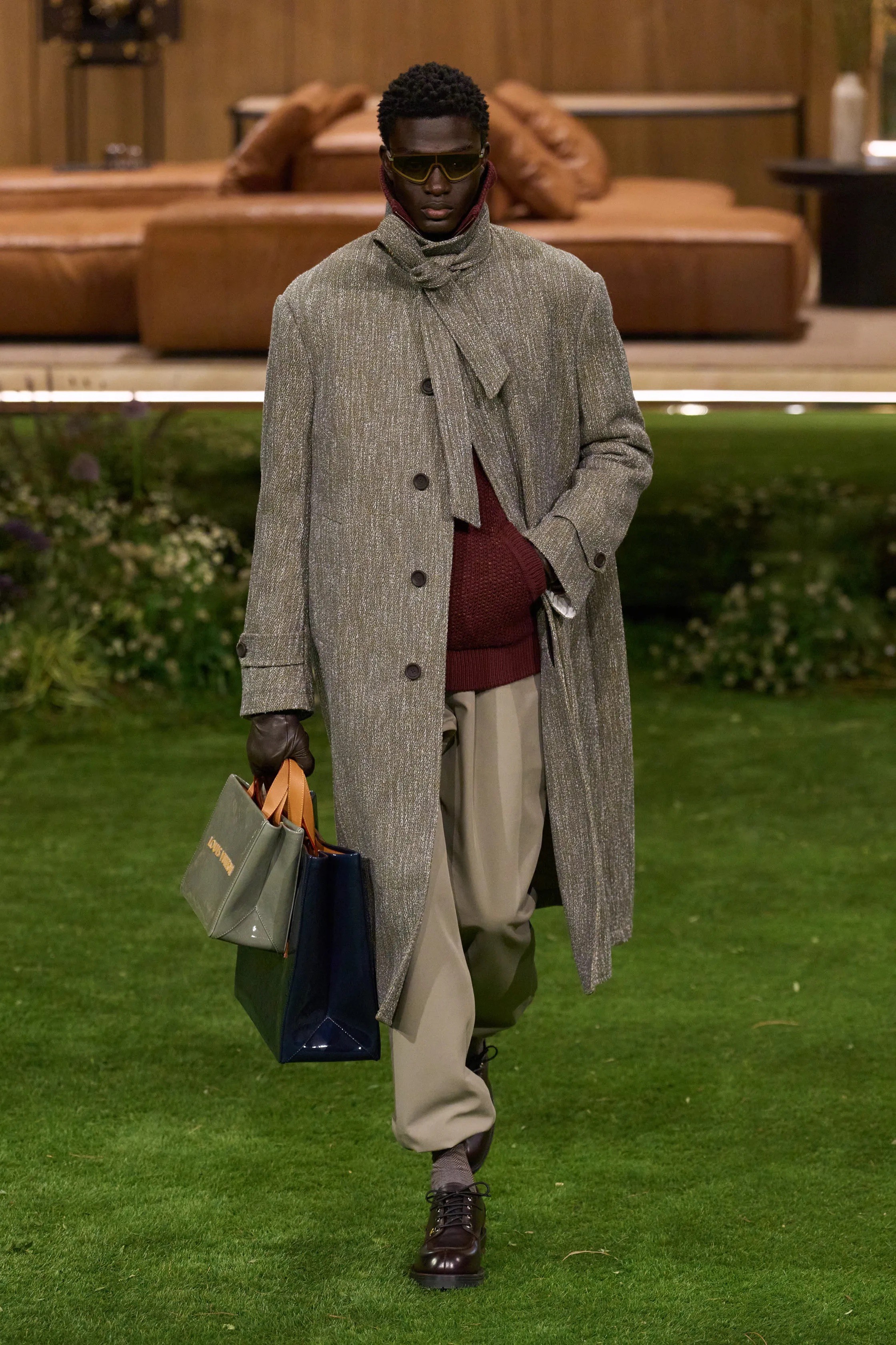 The strongest moments came from this friction between tradition and function. Checked suits appeared elegant but improbably lightweight. Outerwear appears formal then transitions into a sporty look. Accessories followed suit: caps that folded, bounced back, and shrugged off water; shoes that read heritage but flexed like trainers. Even the leather goods leaned practical, designed to flip, adapt, or survive real use - a rare thing on a luxury runway.