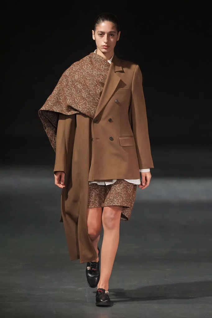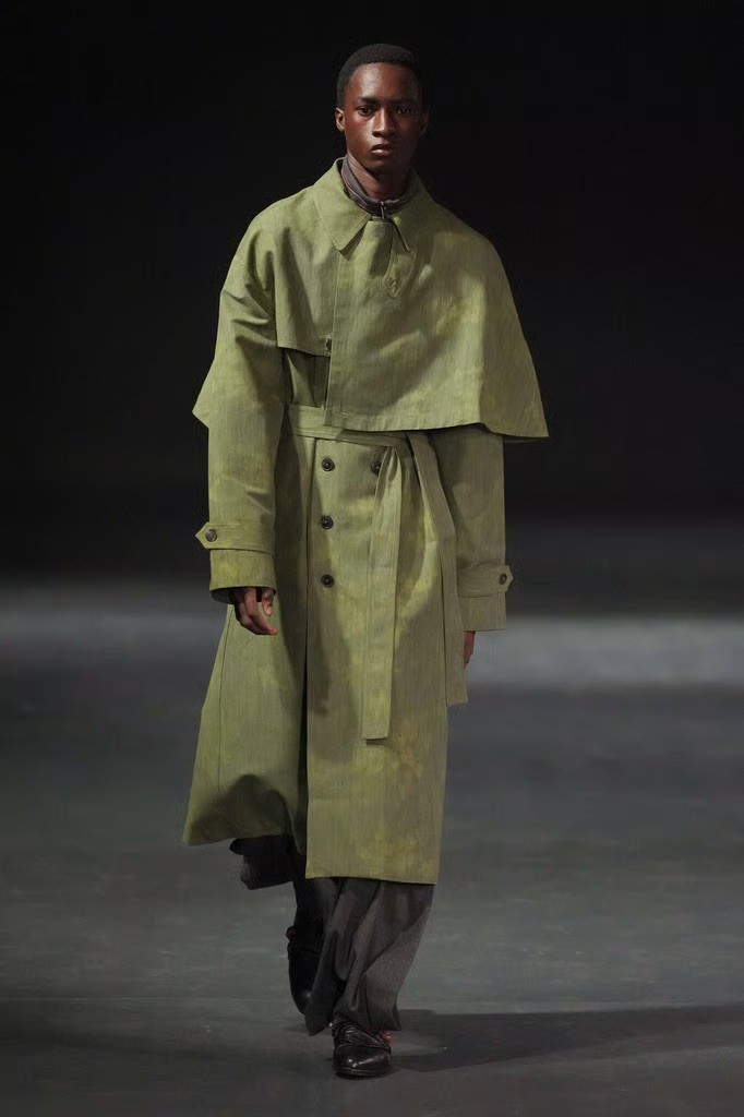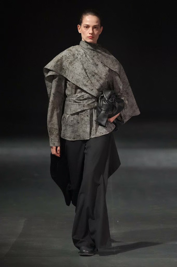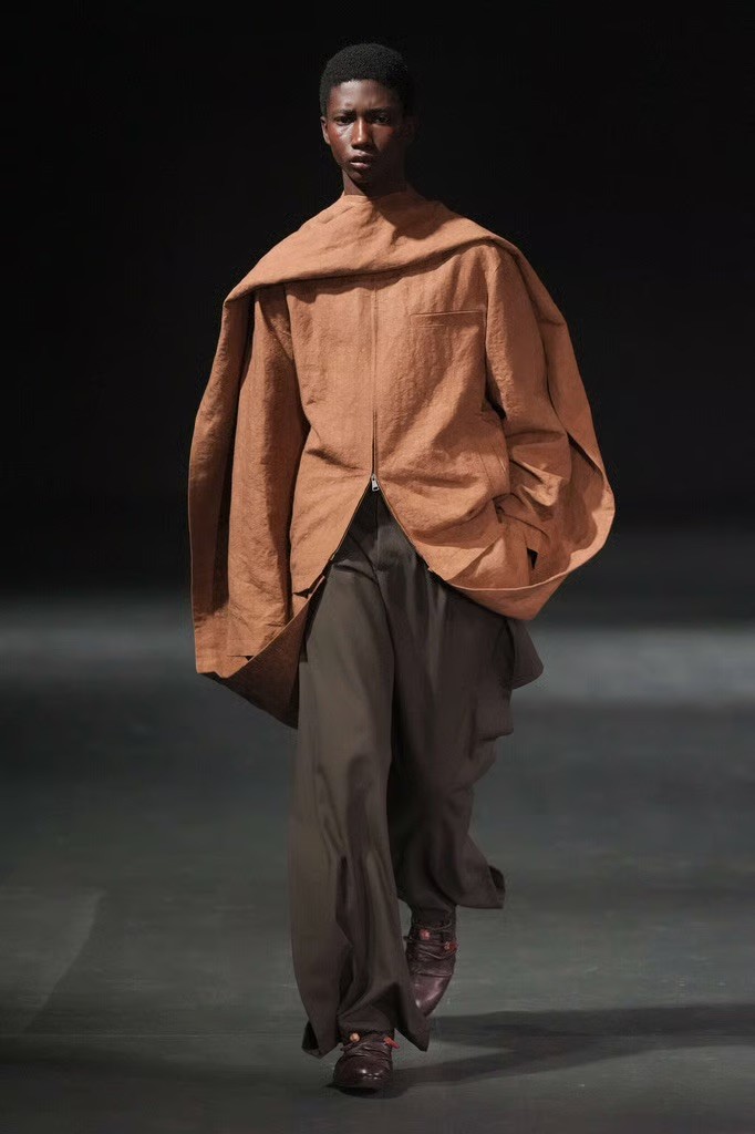 Fabric played a central role. Oversized panels wrapped and folded around the body, capes emerged from blazers, scarves were built directly into coats, and blanket-like textiles hung with deliberate weight. Bias-cut half-capes traced blouses and tops, worn across genders, reinforcing a sense of continuity rather than division.
