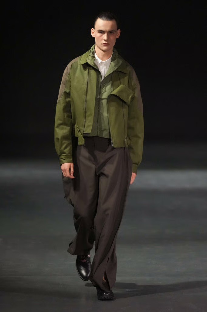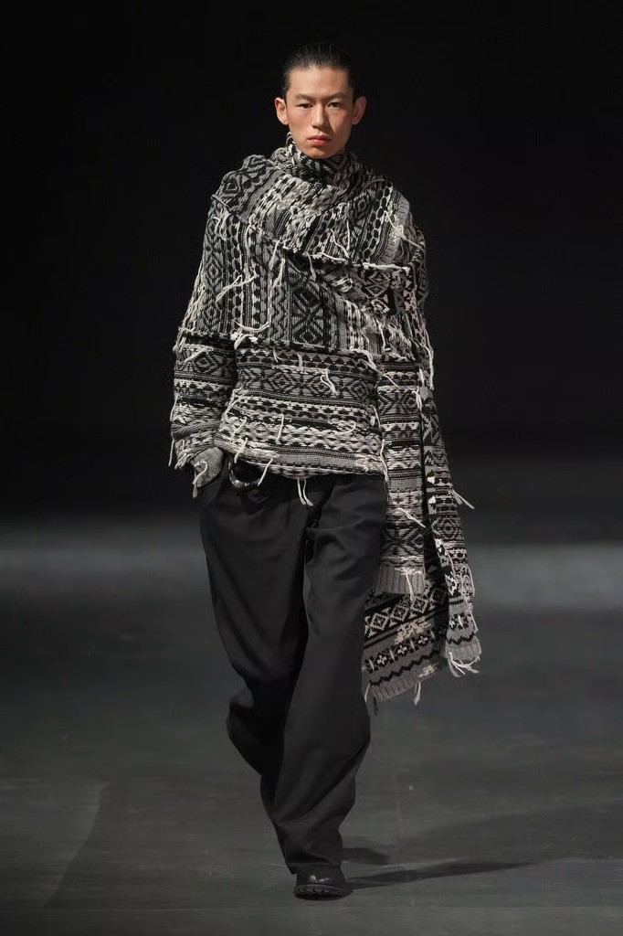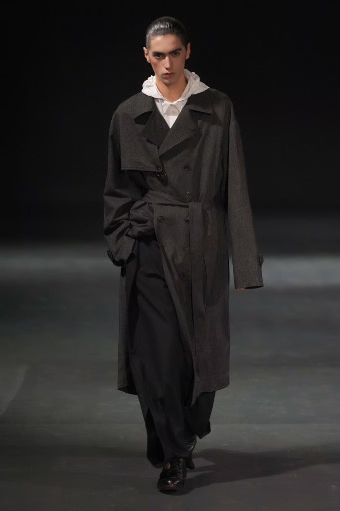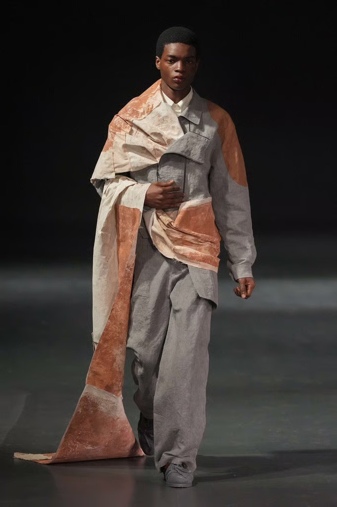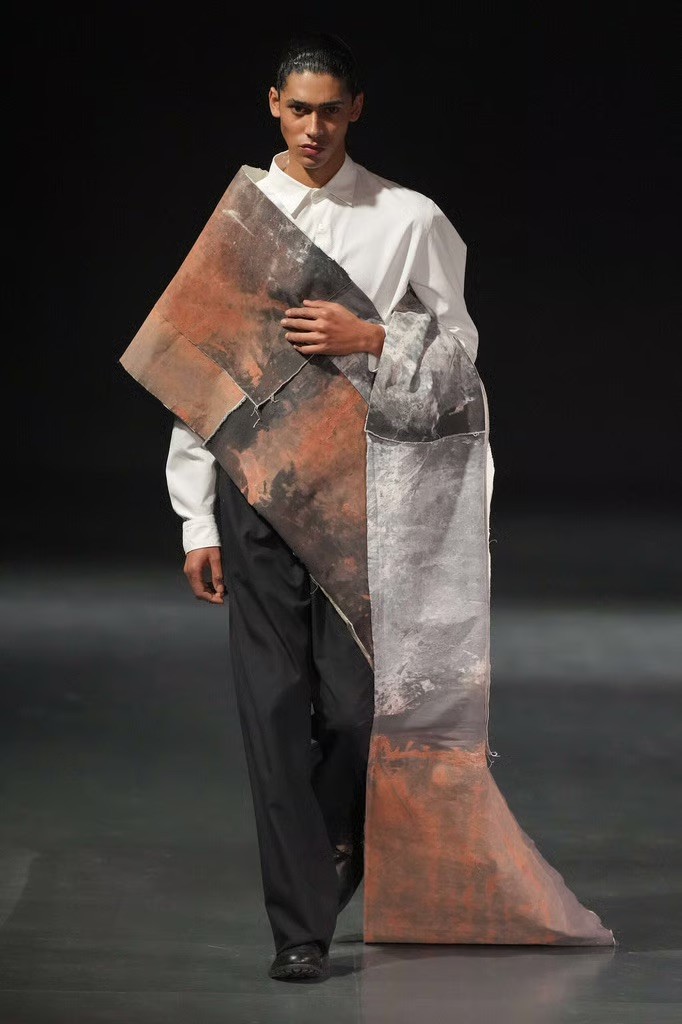 Fabric played a central role. Oversized panels wrapped and folded around the body, capes emerged from blazers, scarves were built directly into coats, and blanket-like textiles hung with deliberate weight. Bias-cut half-capes traced blouses and tops, worn across genders, reinforcing a sense of continuity rather than division.