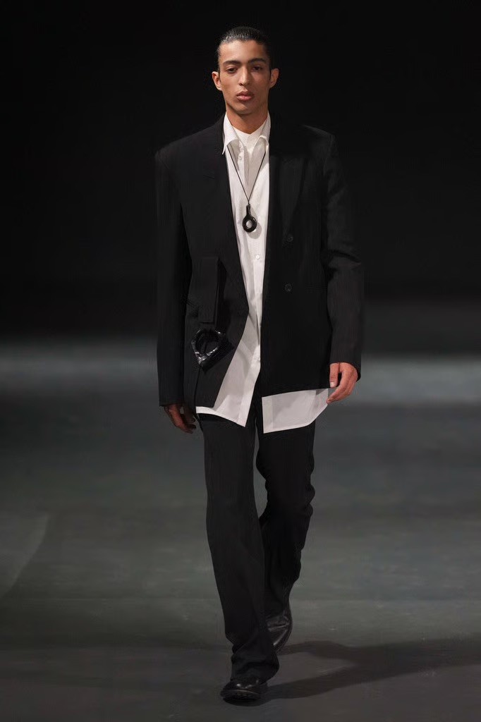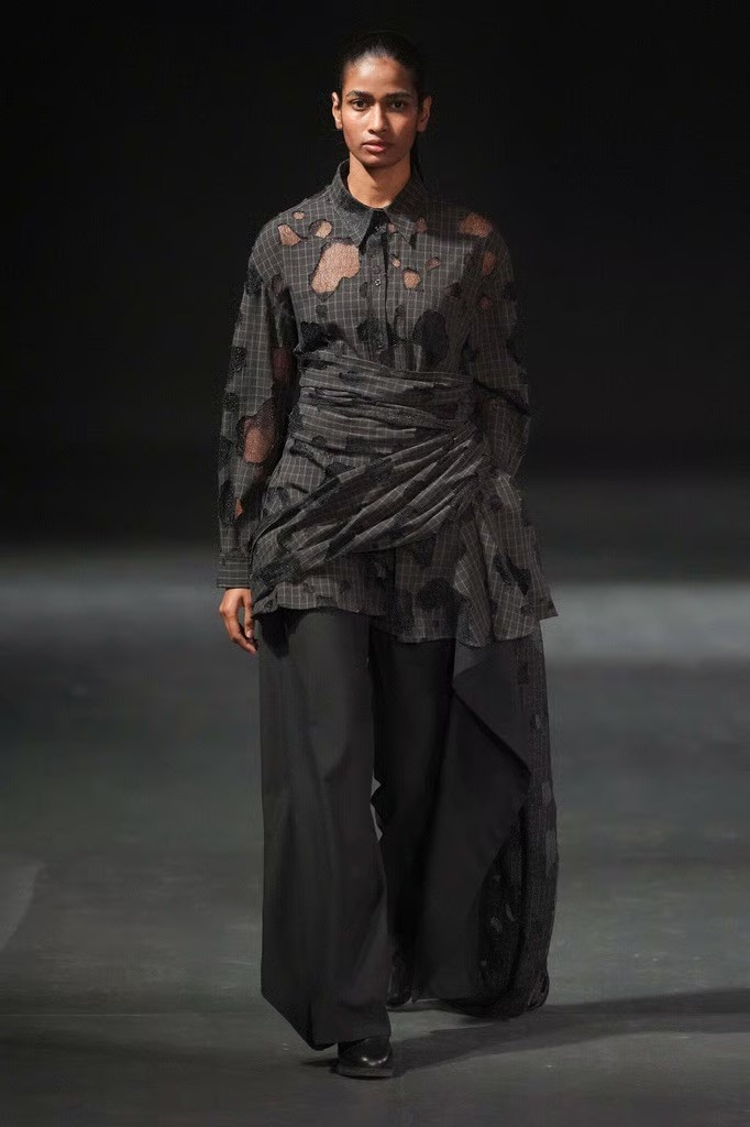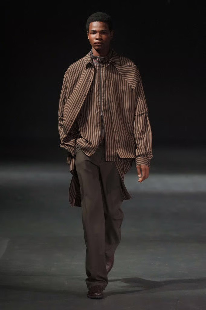 Hoor Al-Qasimi opened with softly tailored pieces that set a quieter tone. A pinstriped suit worn simply, without excess styling, gave way to garments built through layering, draping, and distortion. Familiar wardrobe archetypes - coats, blazers, knits - were reworked.