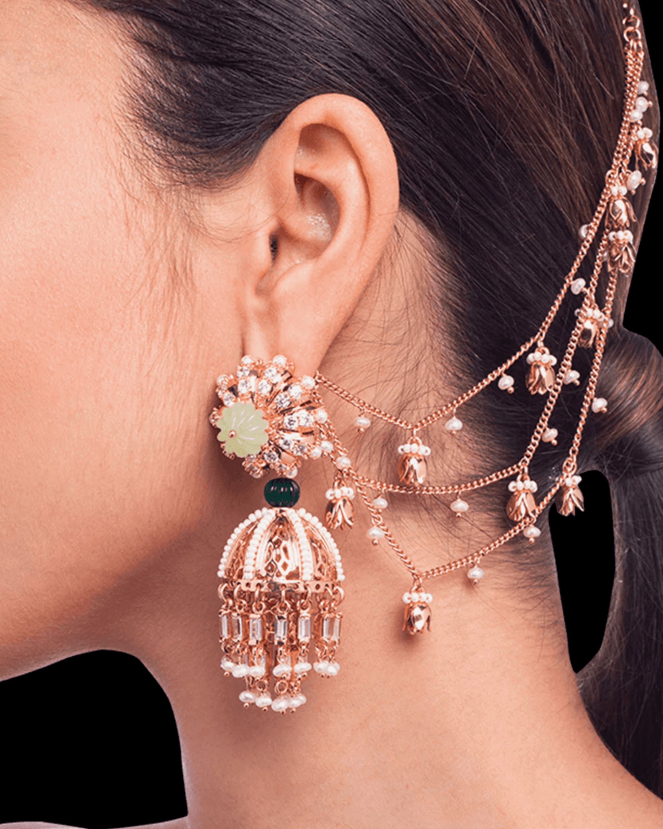 Ritika Sachdeva Gold Jhumka With Kaan Chain Pearls Green Drops Mirrors Earrings