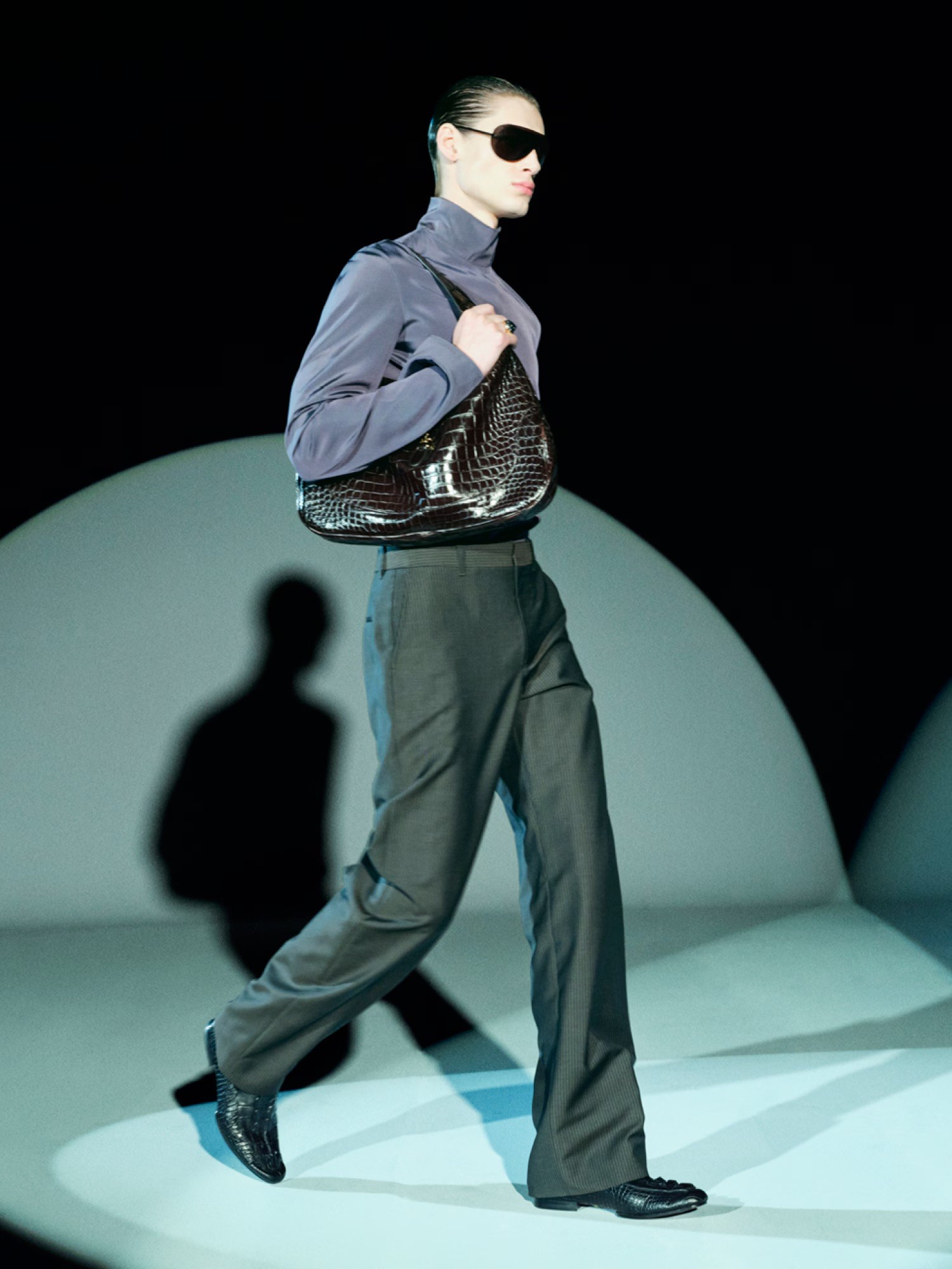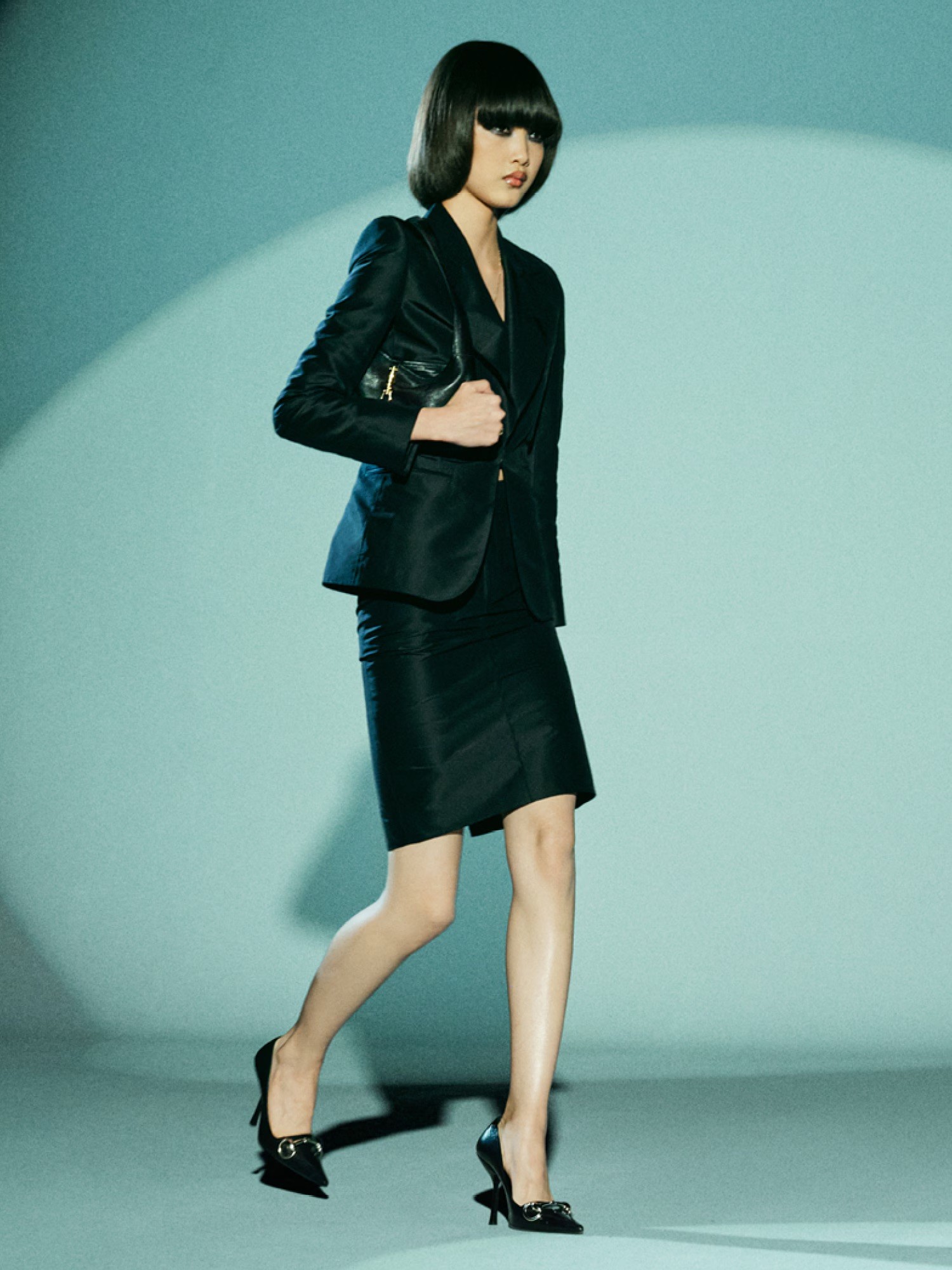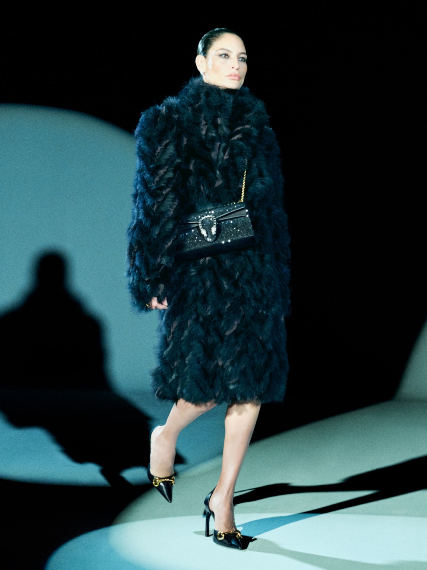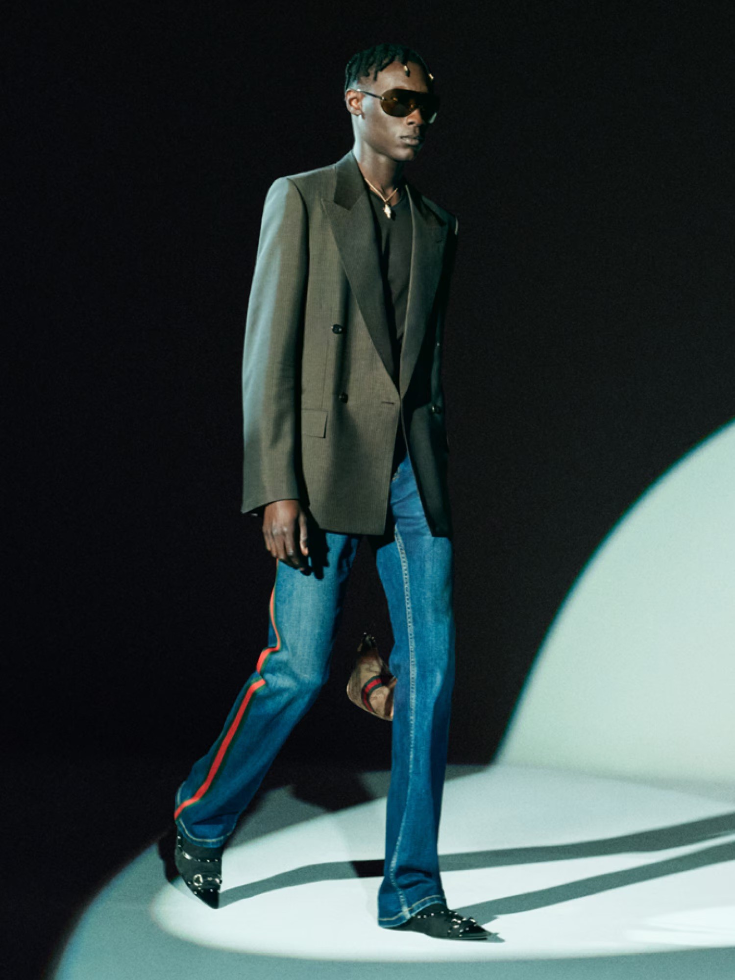 Capturing them in motion, the clothes speak of stories they are living within. Allowing the dressed to have movement; to be animated. Suiting, both men’s and women’s, has its moment in this collection. Sharp tailoring, dressed down with denim and straight-fit trousers in a glossy finish, further riffing on the ‘70s Gucci codes.