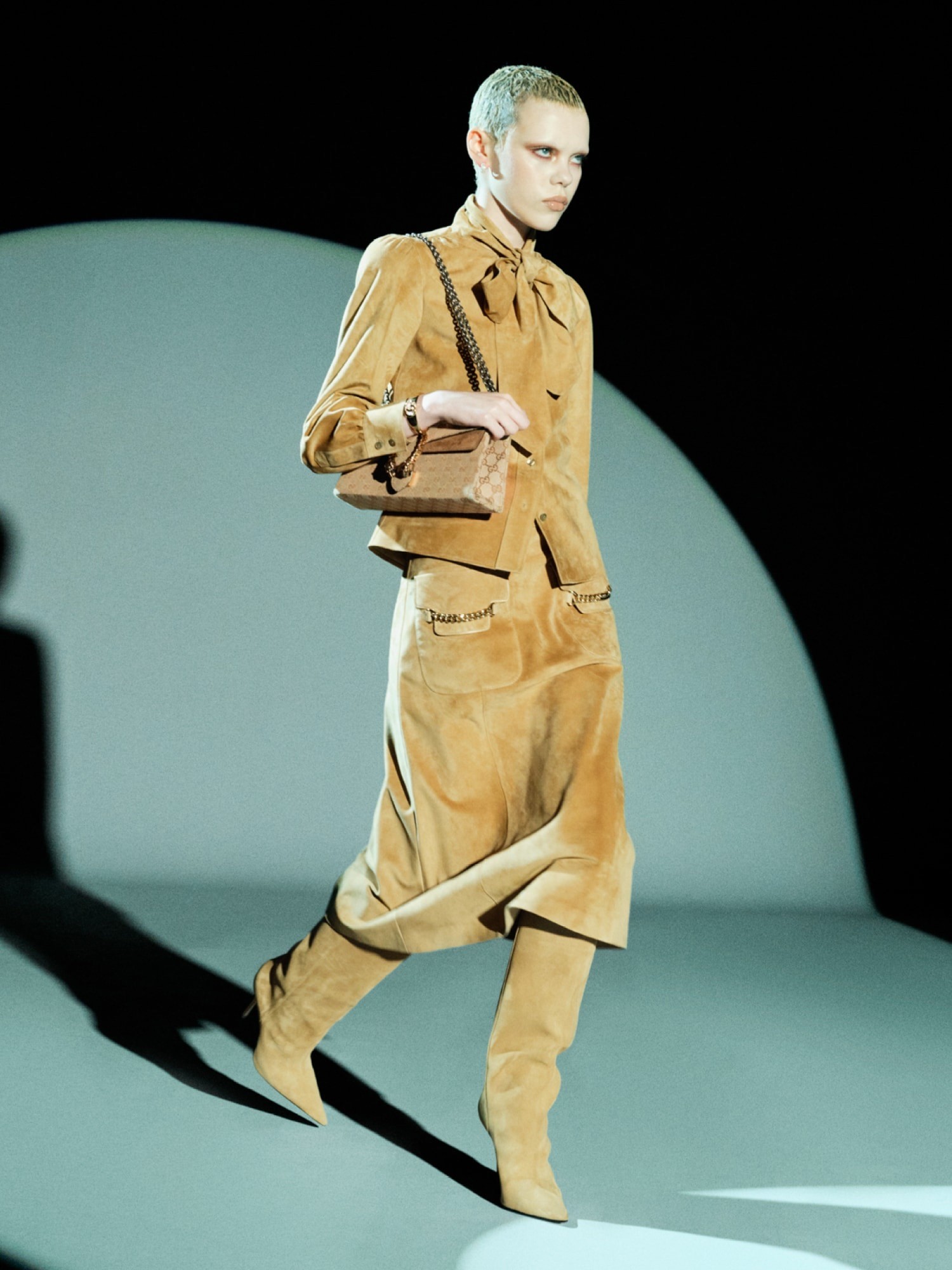 A quick audit of the colours of the collection allows you to chart the journey the brand has been on so far. With past creative directors each bringing something unique to the fabric of Gucci. From vibrant red to a polished plum and beyond to a suede beige, we now see where Gucci has been, and with Demna’s discerning curation, we see where it’s going.