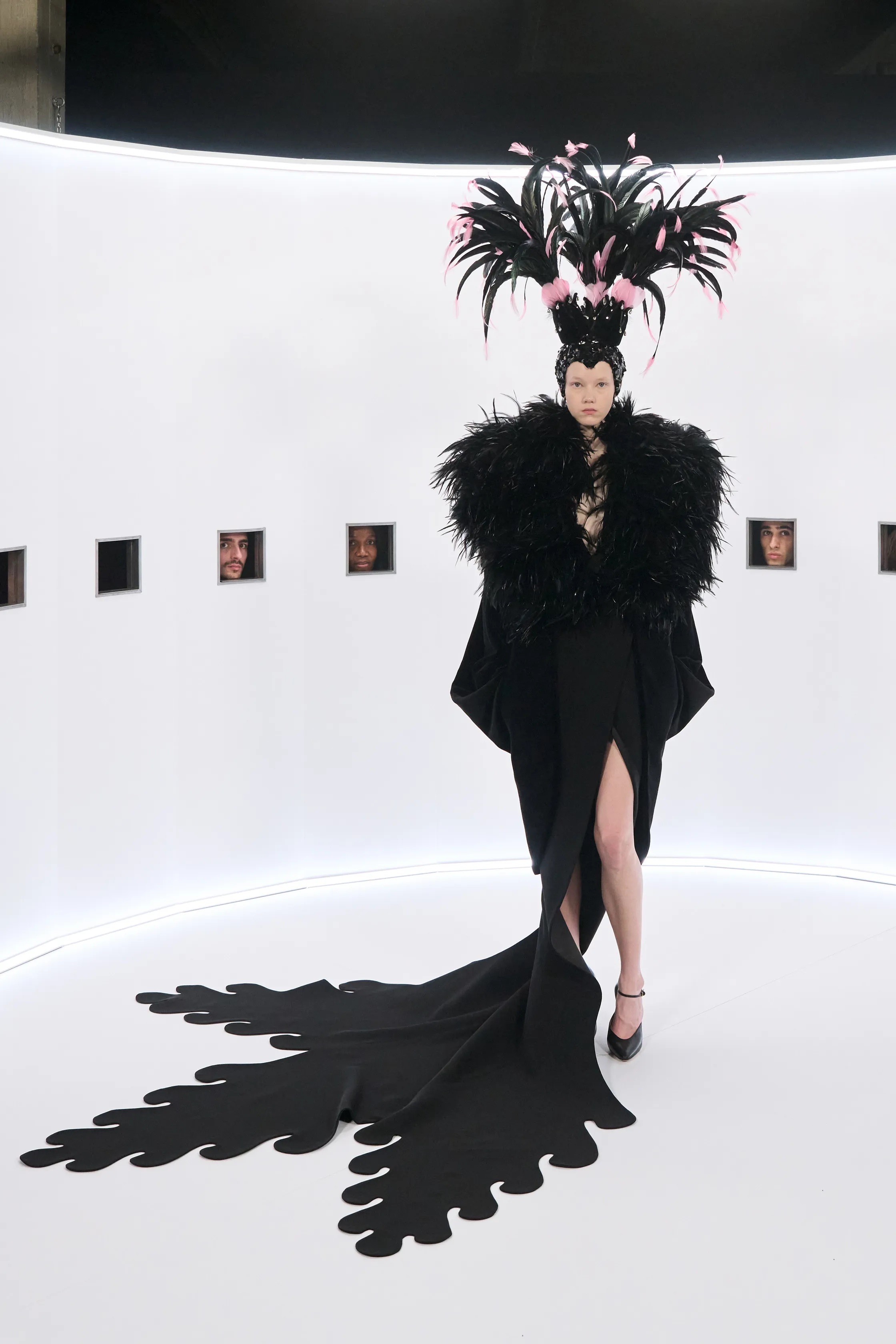 Depending on where you were seated, your “opening act” changed. Some saw old-Hollywood tailoring, others saw drama dialled all the way up: a caftan edged in gold sequins licking at the neckline and sleeves, crowned with a towering feathered headdress.