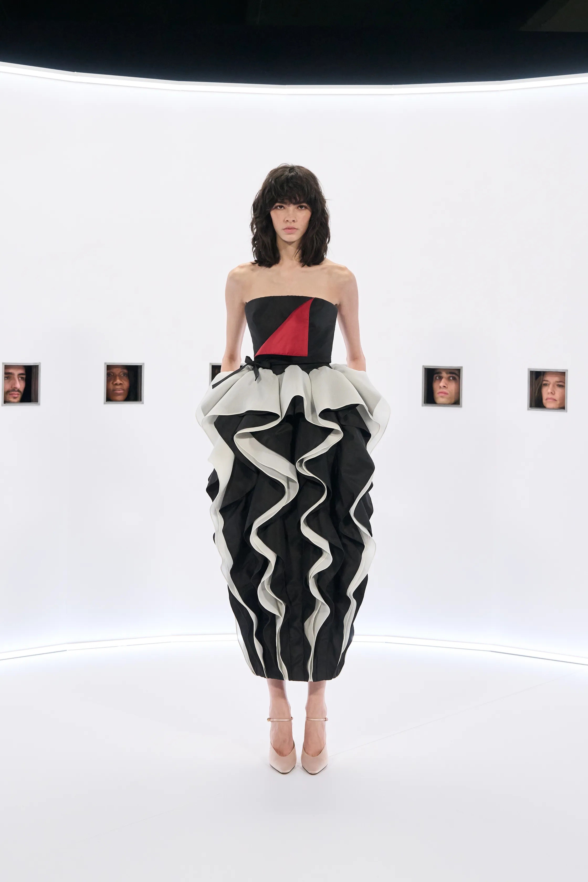 At the Tennis Club de Paris, Michele staged one of the most unusual couture presentations in recent memory. Models didn’t walk a runway so much as appear - one by one - inside circular kaiserpanoramas, a 19th-century pre-cinema viewing device. Guests peered through small square windows, turning the audience into voyeurs, fashion editors reduced to wide-eyed spectators waiting for the next reveal.