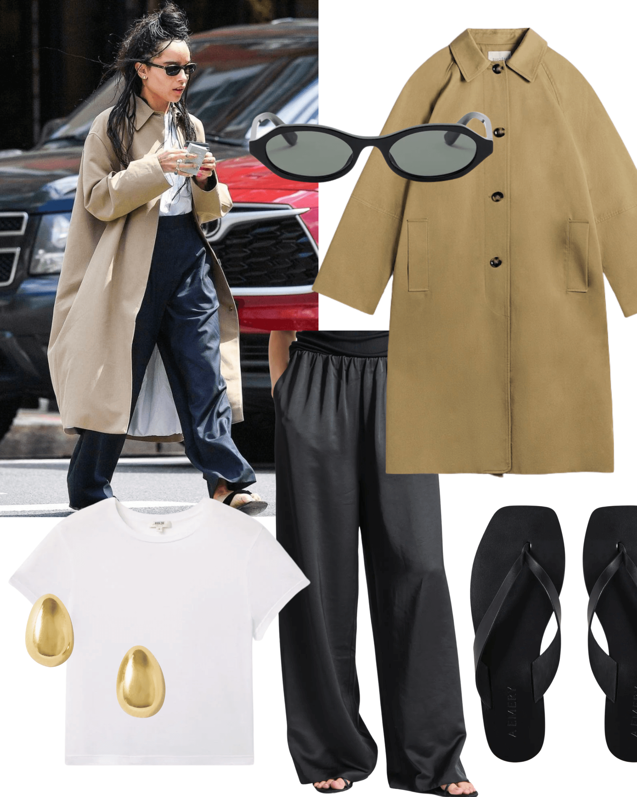 BHOEM Oversized Trench Coat, Saint Art Paige Pull On Pants, Agolde Adine Shrunken Tshirt, A.Emery Kinto Sandal, McQueen Geometric Oval Sunglasses, Sophie Buhai Tiny Egg Gold Vermeil Earrings