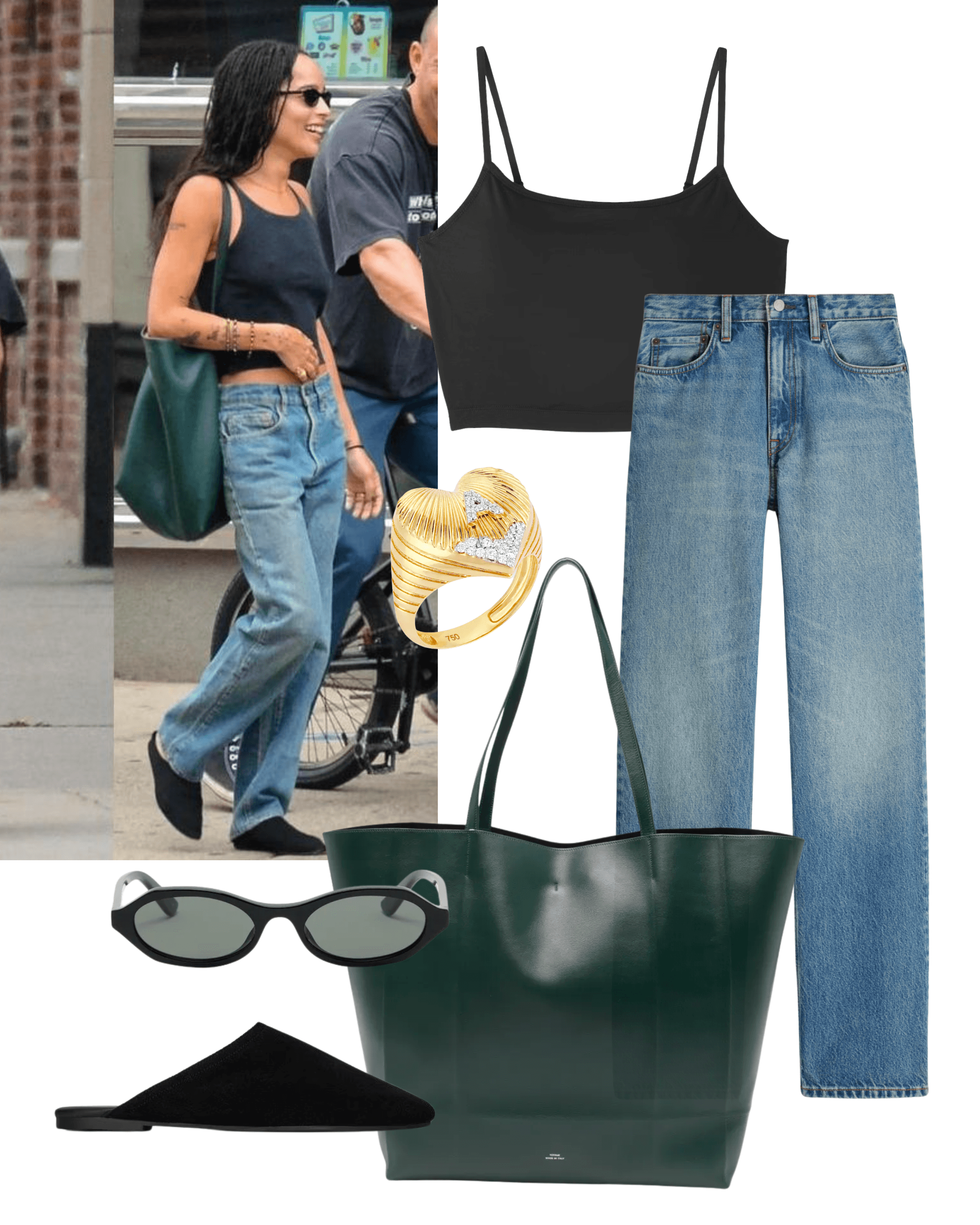 COS Chord Straight Leg Jeans, MUJI Lyocell Blended Half Bra Camisole, Arket Split Suede Travel Slippers, McQueen Geometric Oval Sunglasses, Toteme Green Roam Leather Tote, Maveroc Heart Coded Ring