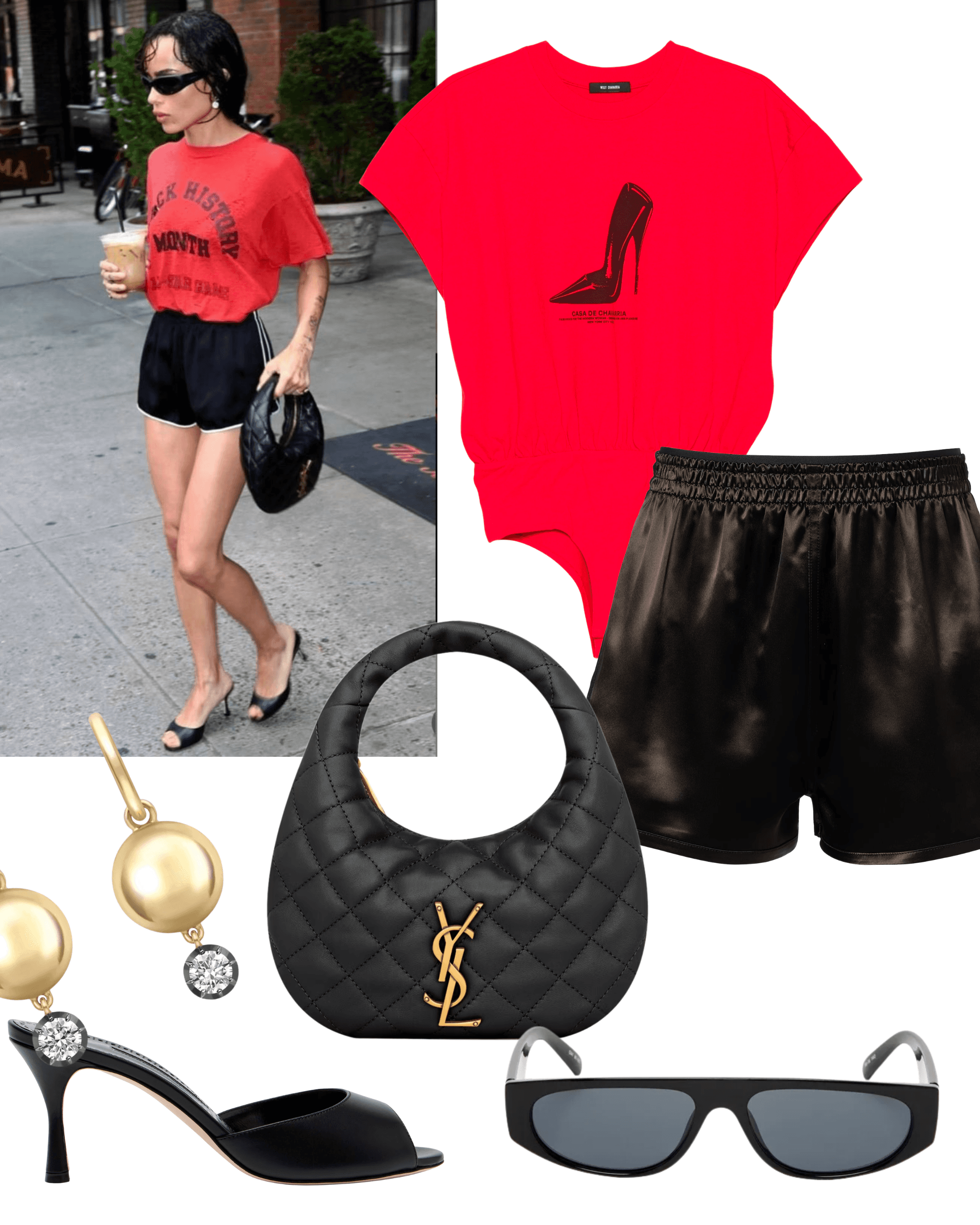 Willy Chavarria Logo Print Tshirt, Phoebe Philo Satin Track Shorts, Saint Laurent Icarino Mini Quilted Bag, Jessica McCormack Orbit Yellow Gold & Diamond Sphere Hoop Earrings, Manolo Blahnik Jada 70 Leather Mules, Le Specs Le Ritual Sunglasses