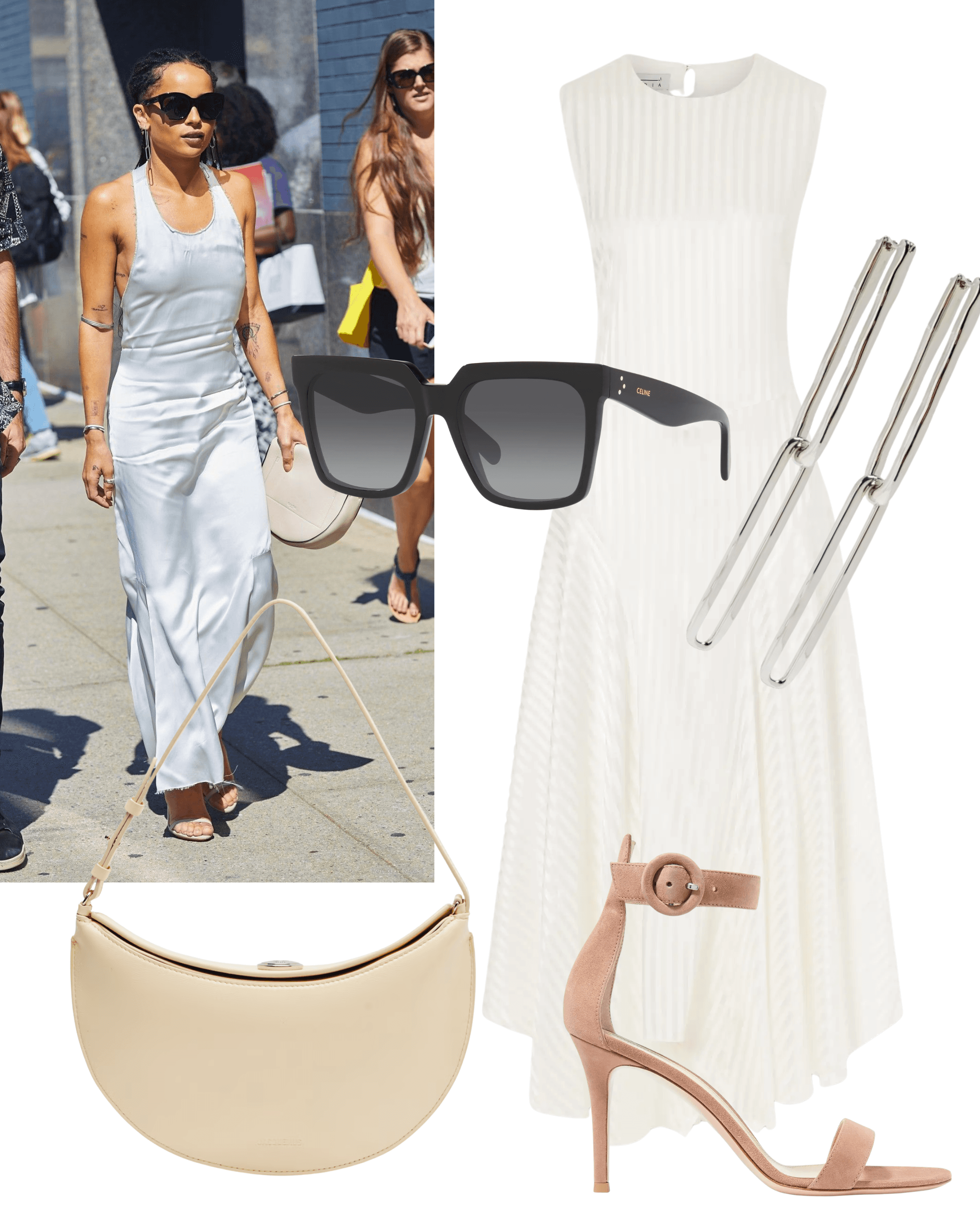 Abadia Striped Stretch Silk Satin Maxi Dress, Gianvito Rossi Suede Portofino 85 Heels, Jil Sander Silver Rectangle Link Earrings, Jacquemus Ovalo Small Leather Shoulder Bag, Celine Sunglasses
