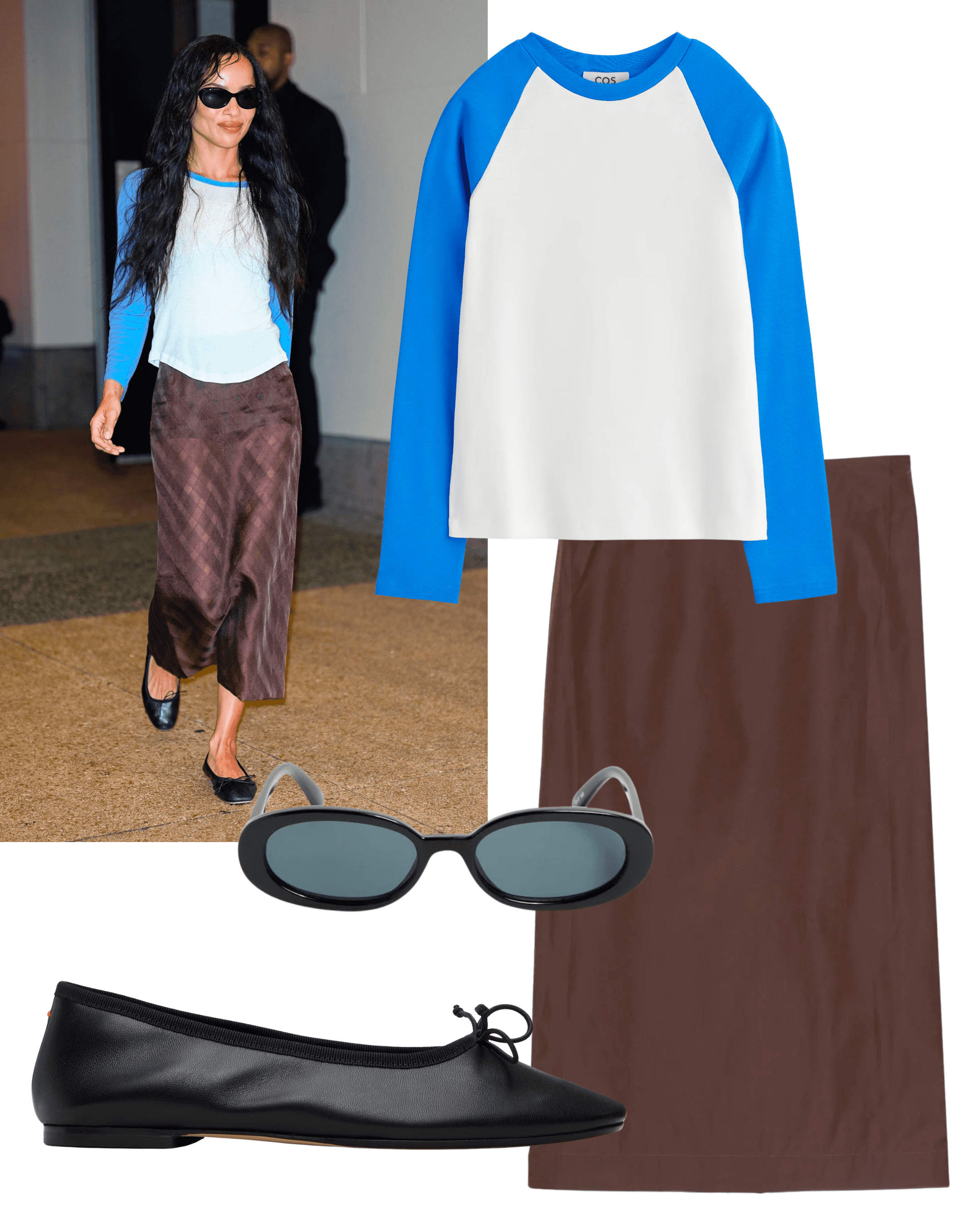 COS Contrast Sleeve Tshirt, St. Agni Midi Skirt, Aeyde Black Tiby Ballet Flats, Le Specs Outta Love Sunglasses